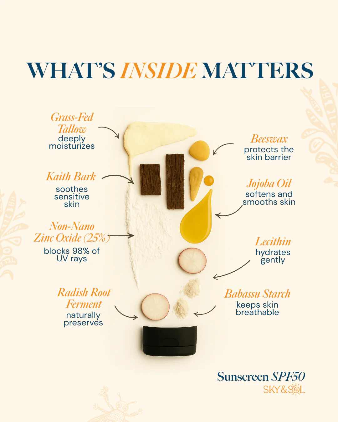 - Skin Biocompatible Tallow Sunscreen formula means no greasiness or breakouts.
